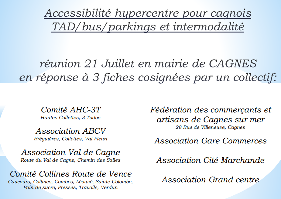 Nos réussites Bassin Sainte-Colombe (2025) Actions CCRV-Mairie-MNCA (2025) Création collectif Comités de Quartiers, Associations et Fédération de commerçants dans le cadre de l’amélioration de l’accessibilité hypercentre pour cagnois (2025) ->Suivi du projet<-